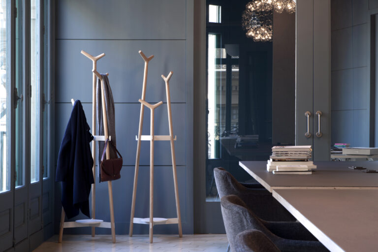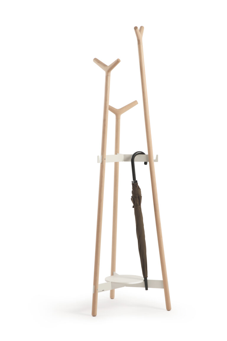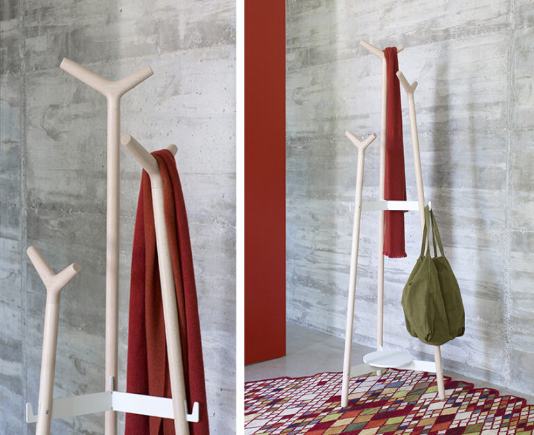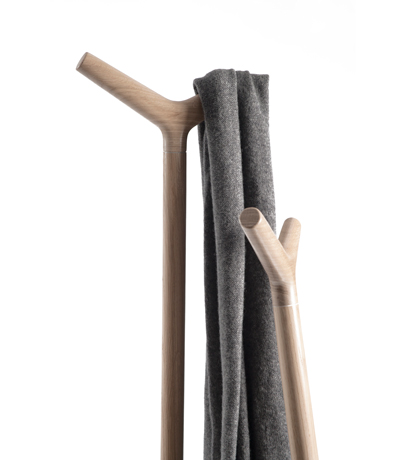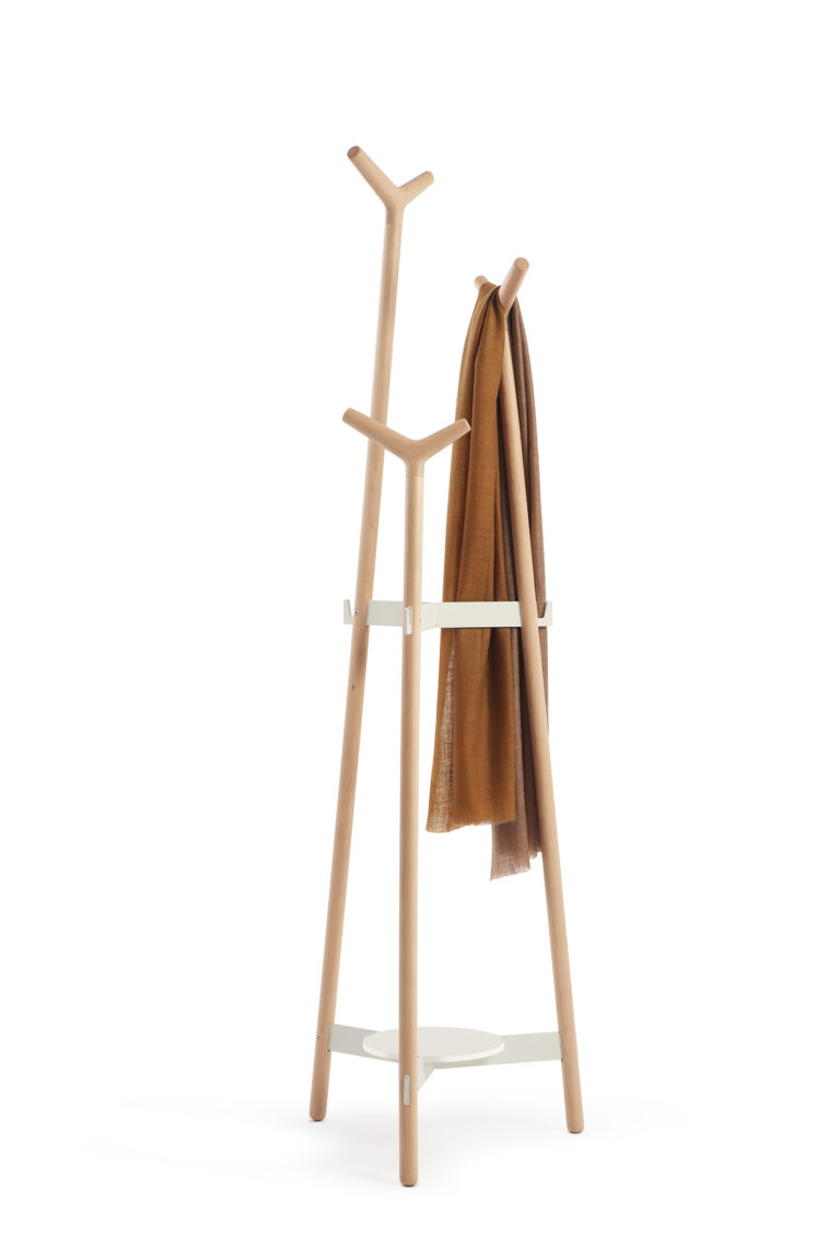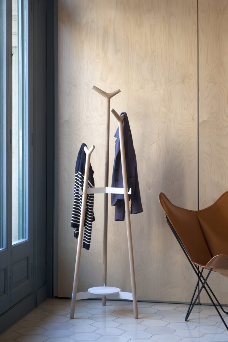 La disposición de las perchas de madera, de formas suaves, permite colgar todo tipo de prendas y complementos a diferentes alturas.