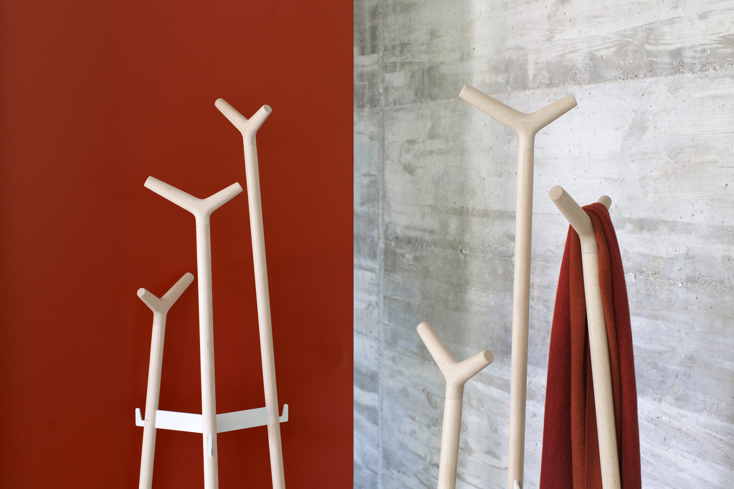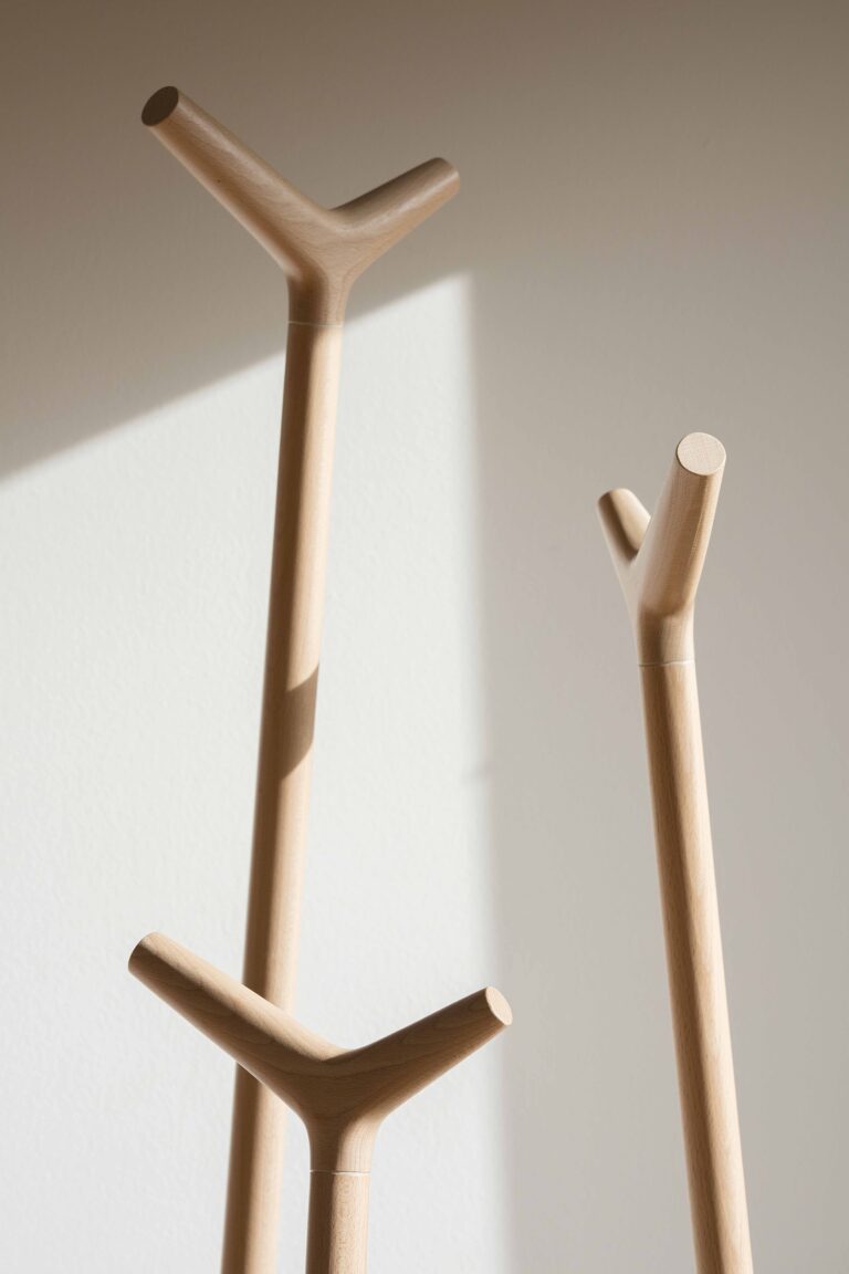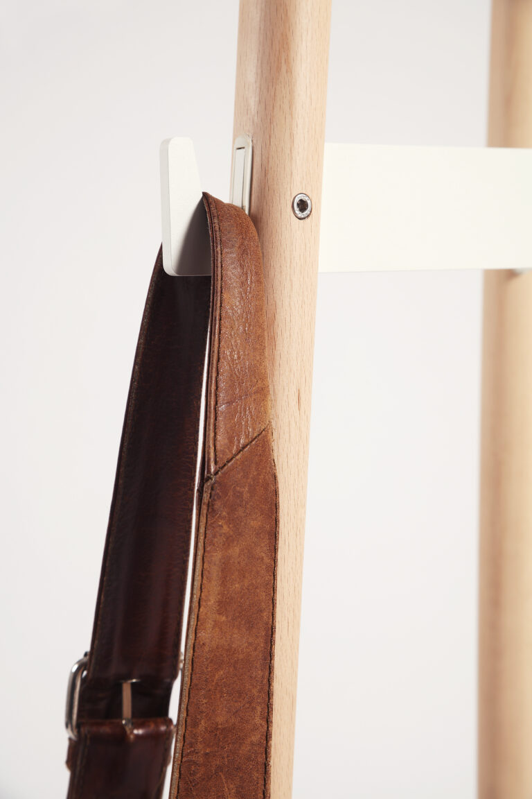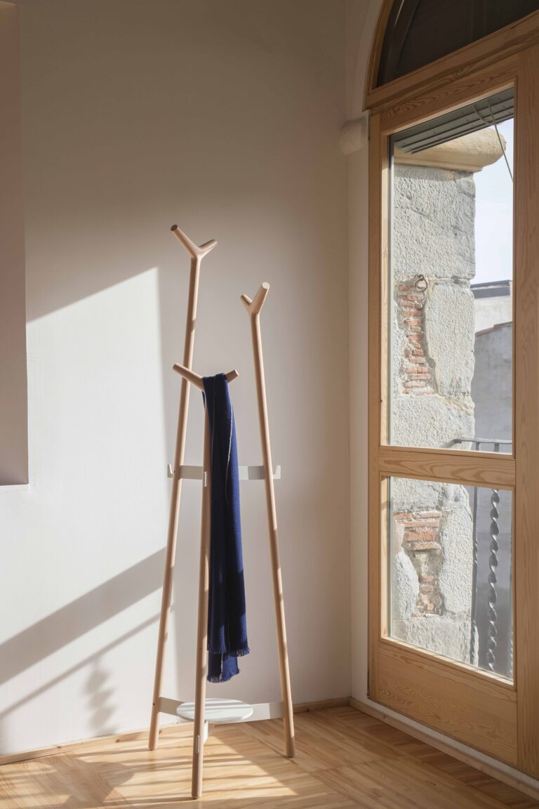 La disposición de las perchas de madera, de formas suaves, permite colgar todo tipo de prendas y complementos a diferentes alturas.